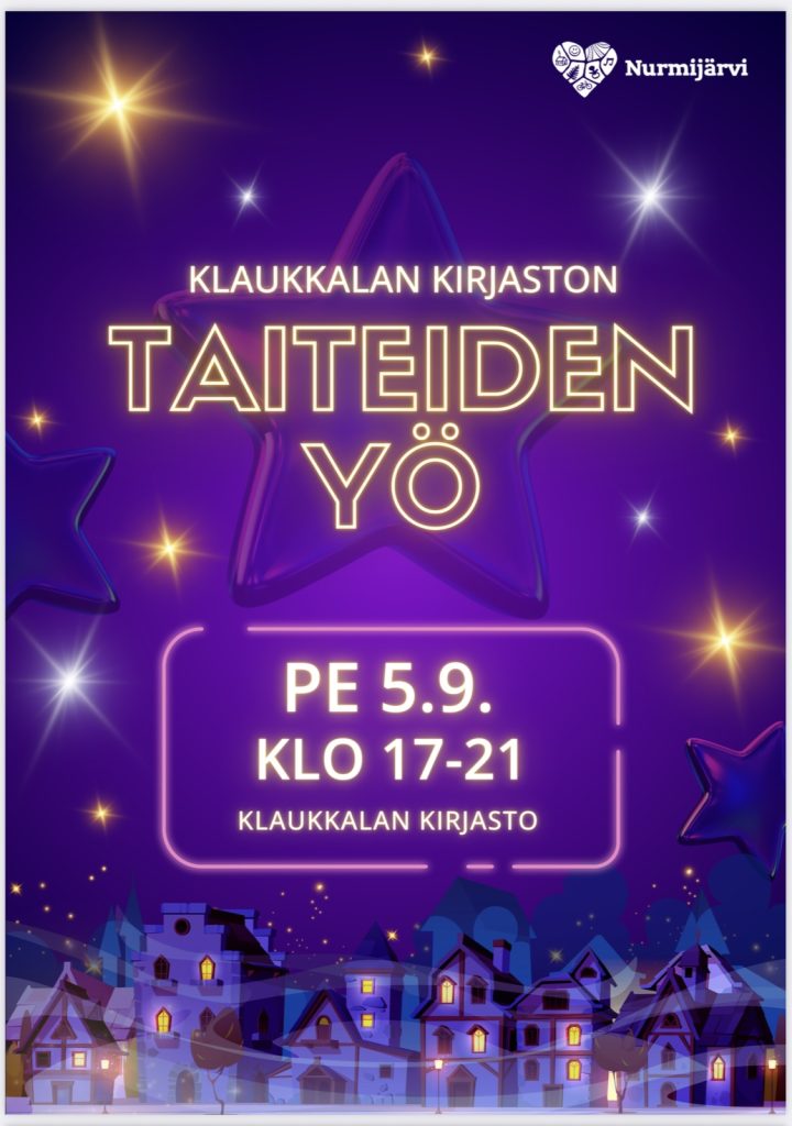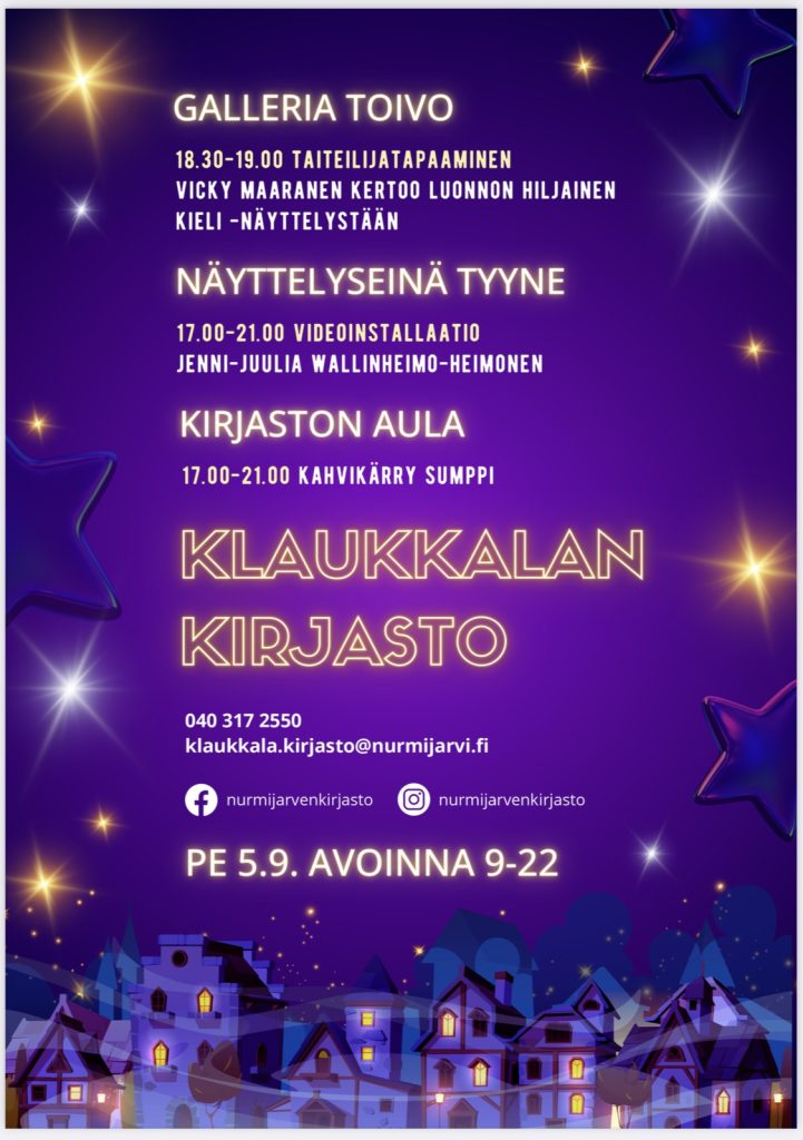 Taidekieppi järjestää Klaukkalan kirjastossa Vicky Maarasen & Jenni-Juulia Wallinheimo-Heimosen taidenäyttelyt 5.9.-31.10.2025. Kirjastossa vietetään myös taiteiden yötä 5.9. klo 9-22.